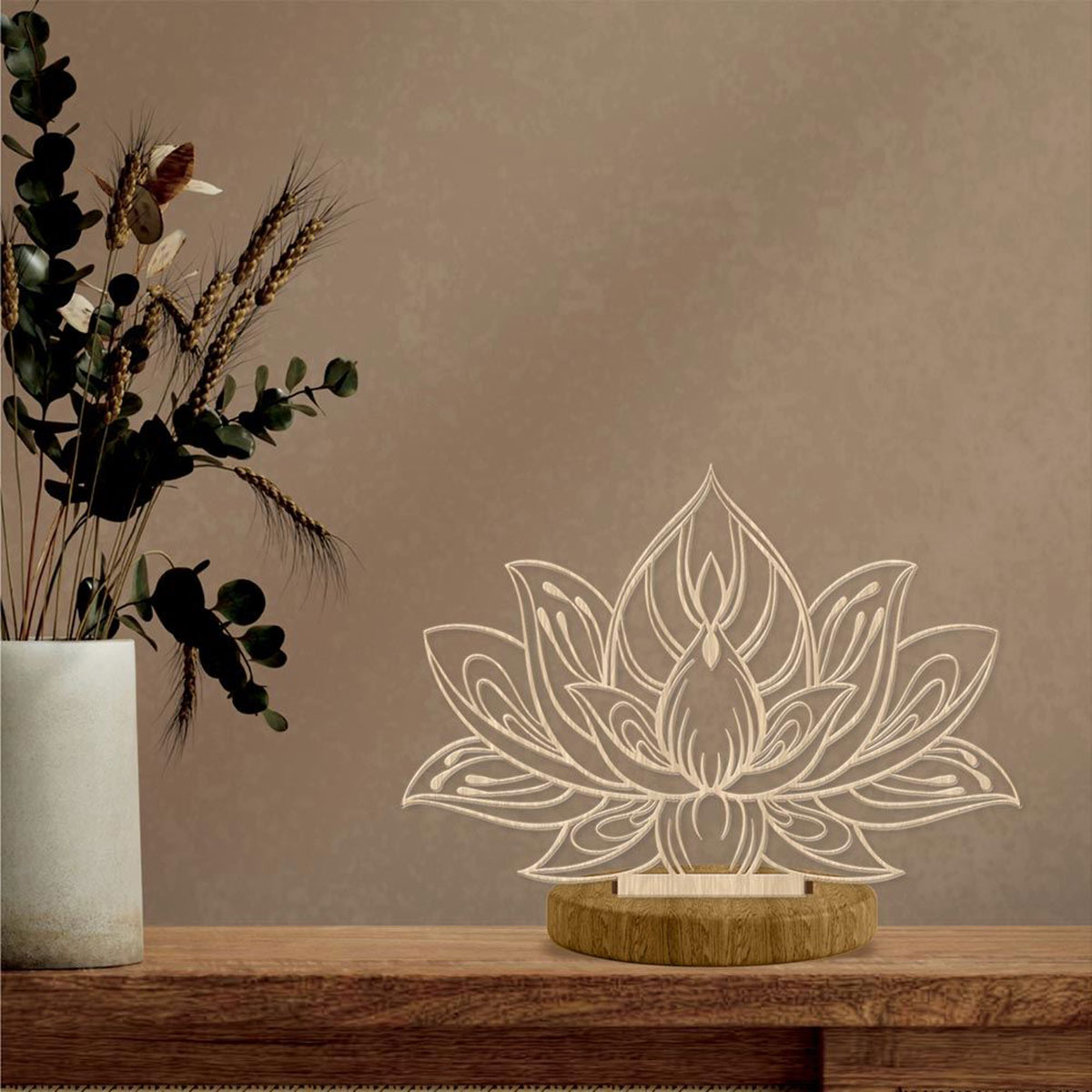 Décoration à poser – Fleur de Lotus en bois | Style zen et épuré Design élégant et naturel : Fleur de Lotus finement découpée en bois clair, posée sur un socle rond en bois foncé pour un contraste harmonieux. Matériaux : Bois naturel clair (fleur) et foncé (socle), finition artisanale signée STC. Dimensions pratiques : Hauteur 22 cm x Largeur 25 cm, parfaite pour une étagère, un meuble d’entrée ou un coin méditation.