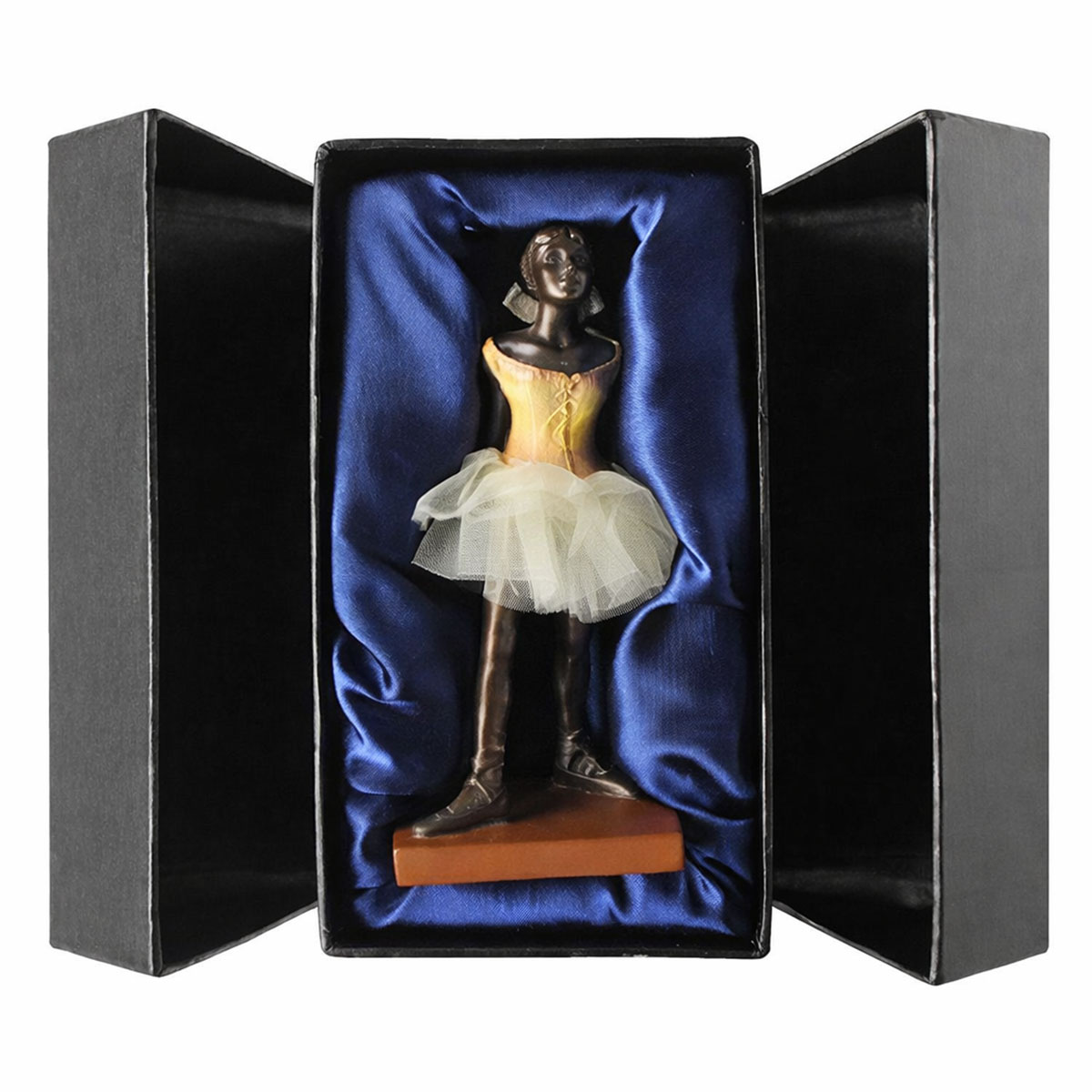 • Figurine inspirée de l’œuvre emblématique de Edgar Degas, Petite danseuse de quatorze ans • Hauteur 11,5 cm – Largeur 5 cm – Profondeur 4,5 cm, format élégant et décoratif • Réalisée en résine avec finition bronze et tutu beige en tissu • Présentée sur un socle et livrée dans un coffret de protection Parastone • Objet décoratif raffiné pour amateurs d’art, de danse classique et de sculpture