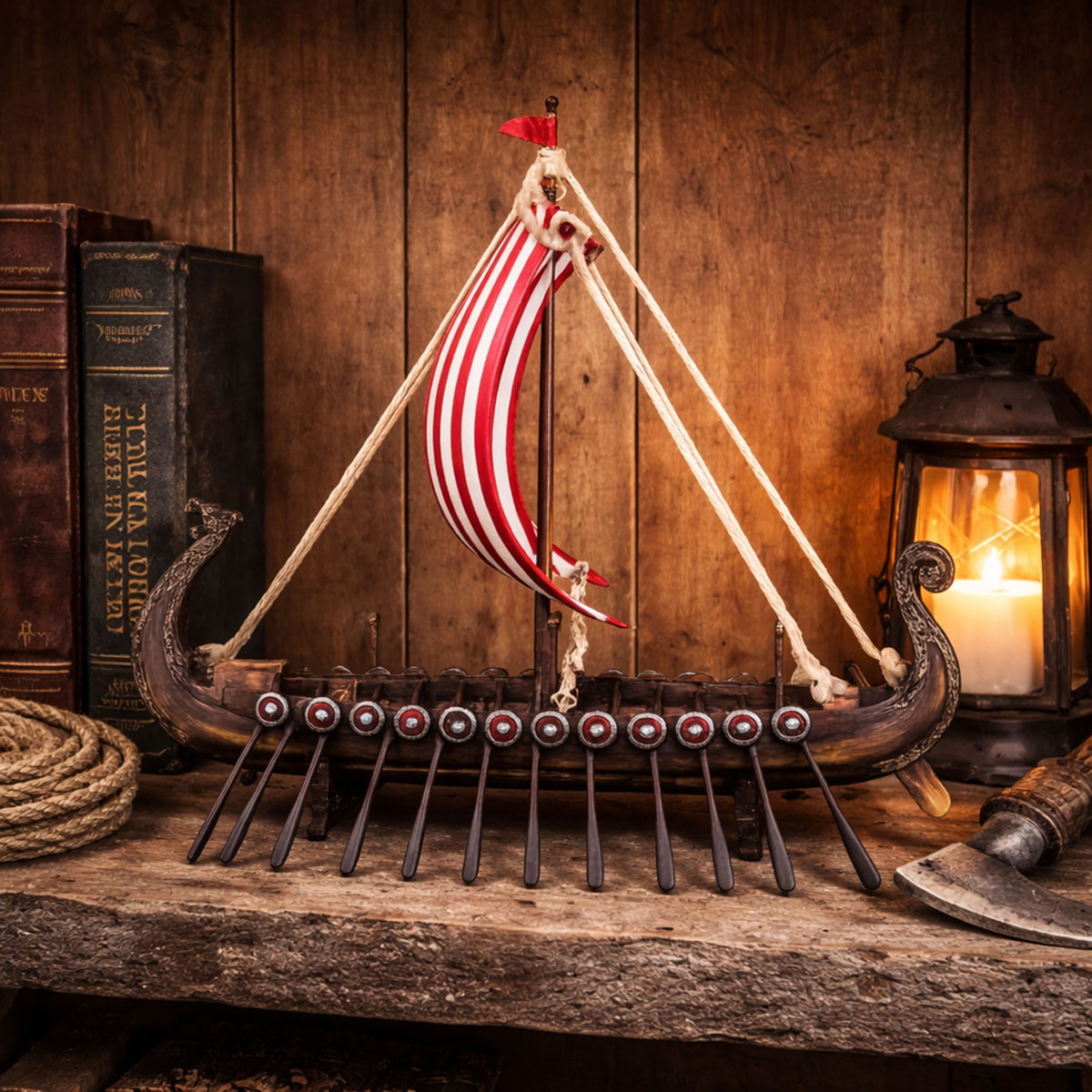 Drakkar Viking – Figurine bateau viking décoratif 18 cm – Résine • Figurine décorative représentant un drakkar viking emblématique • Matière : résine avec nombreux détails sculptés • Dimensions : Hauteur 15 cm – Largeur 18 cm – Profondeur 12 cm • Idéal pour les amateurs de mythologie nordique et d’histoire viking • Parfait pour une vitrine, une bibliothèque ou un bureau Faites revivre l’esprit des Vikings avec cette figurine détaillée de drakkar. Ce navire emblématique, symbole d’aventure, de puissance et de découverte, constitue un objet décoratif fascinant pour tous les passionnés d’histoire et de mythologie nordique. Le drakkar occupait une place centrale dans la culture viking. Rapide, maniable et capable de naviguer aussi bien en mer que sur les rivières, il permettait aux célèbres explorateurs scandinaves de parcourir de vastes territoires. Cette figurine capture avec finesse l’élégance et la puissance de ces navires légendaires. De la proue sculptée en tête de dragon jusqu’aux rames alignées le long de la coque, chaque détail évoque les grandes expéditions et l’esprit d’aventure des guerriers nordiques.