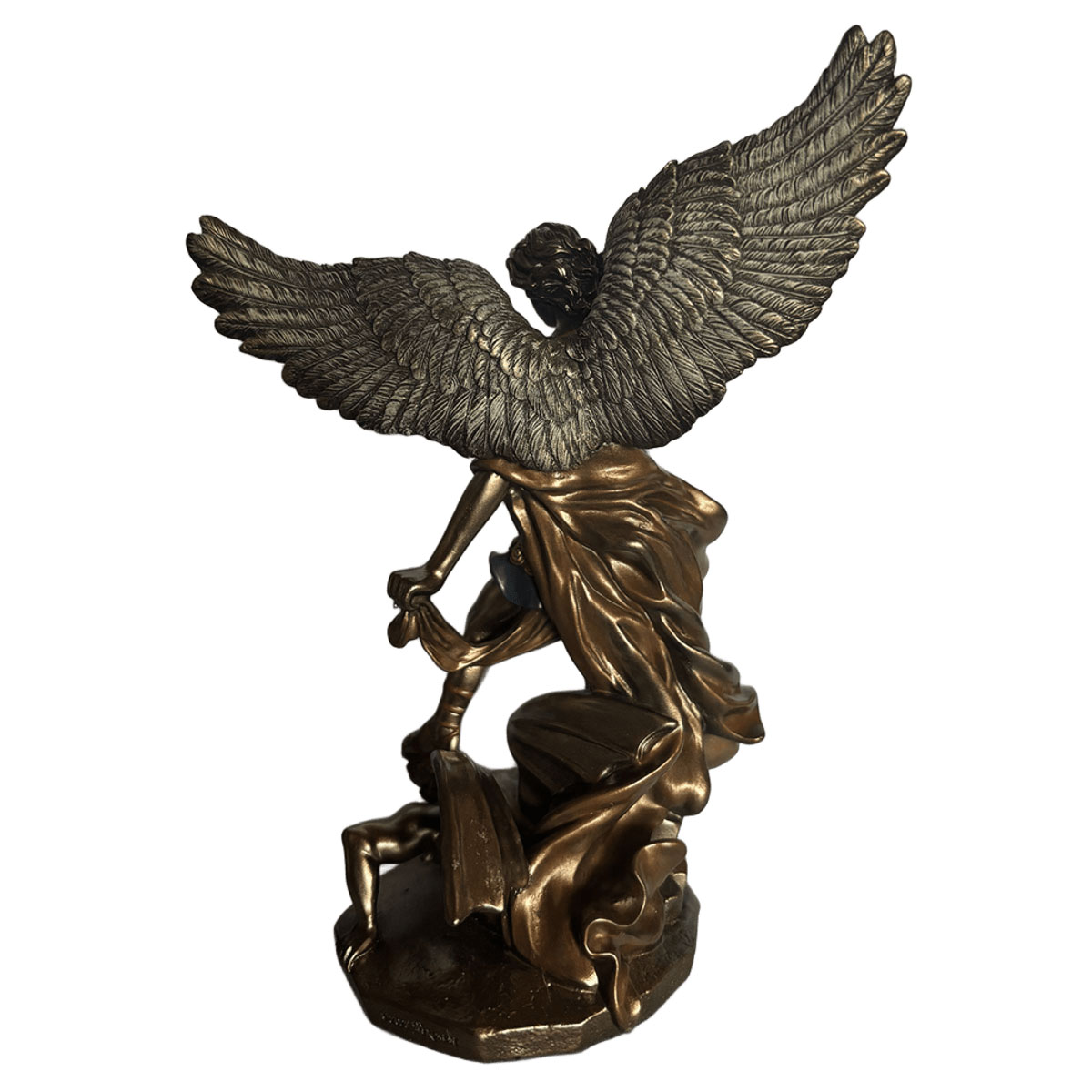 Statue Saint Michel Archange terrassant le démon en bronze coulé à froid 15,5 cm – Statue religieuse décorative livrée en boîte • Statue religieuse représentant Saint Michel Archange terrassant le démon • Matière : bronze coulé à froid (poudre de bronze et résine moulée) • Dimensions : hauteur 15,5 cm – largeur 12 cm – profondeur 6 cm • Coloris principal : marron effet bronze patiné • Statue décorative spirituelle livrée en boîte Cette statue de Saint Michel Archange symbolise la protection, la force spirituelle et la victoire du bien sur le mal. L’archange est représenté dominant le démon dans une posture dynamique et majestueuse aux ailes déployées. Sa finition effet bronze apporte une présence élégante et intemporelle. Elle trouve facilement sa place dans un coin prière, une bibliothèque, un salon ou une décoration religieuse. Le bronze coulé à froid associe de la poudre de bronze véritable à une résine moulée, permettant d’obtenir un rendu proche du bronze traditionnel tout en conservant une statue plus légère. Une belle idée cadeau spirituelle pour une communion, une confirmation ou toute personne attachée à la symbolique de Saint Michel.