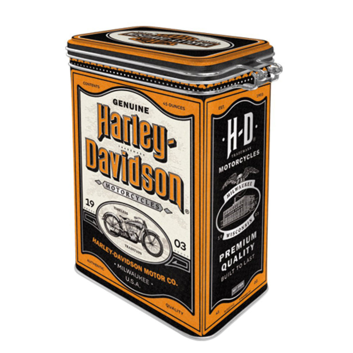 - Fabricant : Nostalgic-Art - Matière : métal robuste - Fermeture hermétique à clip - Dimensions : 17,5 × 11 × 7,5 cm - Design officiel Harley-Davidson - Idéale pour café, thé ou comme boîte déco