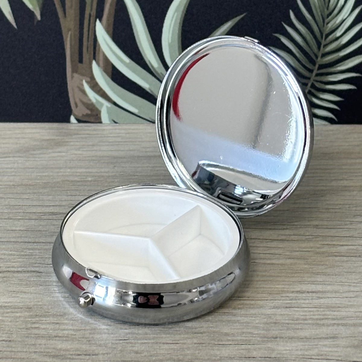 Boite pilulier chatons et papillon En métal et résine Dimensions : Diamètre 5 cm x Hauteur 1.5 cm Ce magnifique pilulier est divisé en 3 compartiments. Ajoutez une touche de douceur à votre routine quotidienne avec la boîte à pilules "Chaton". Conçue en métal et résine, cette boîte élégante se distingue par son design charmant et pratique. Avec un diamètre de 5 cm et une hauteur de 1.5 cm, elle est suffisamment compacte pour se glisser facilement dans votre sac à main ou votre poche.