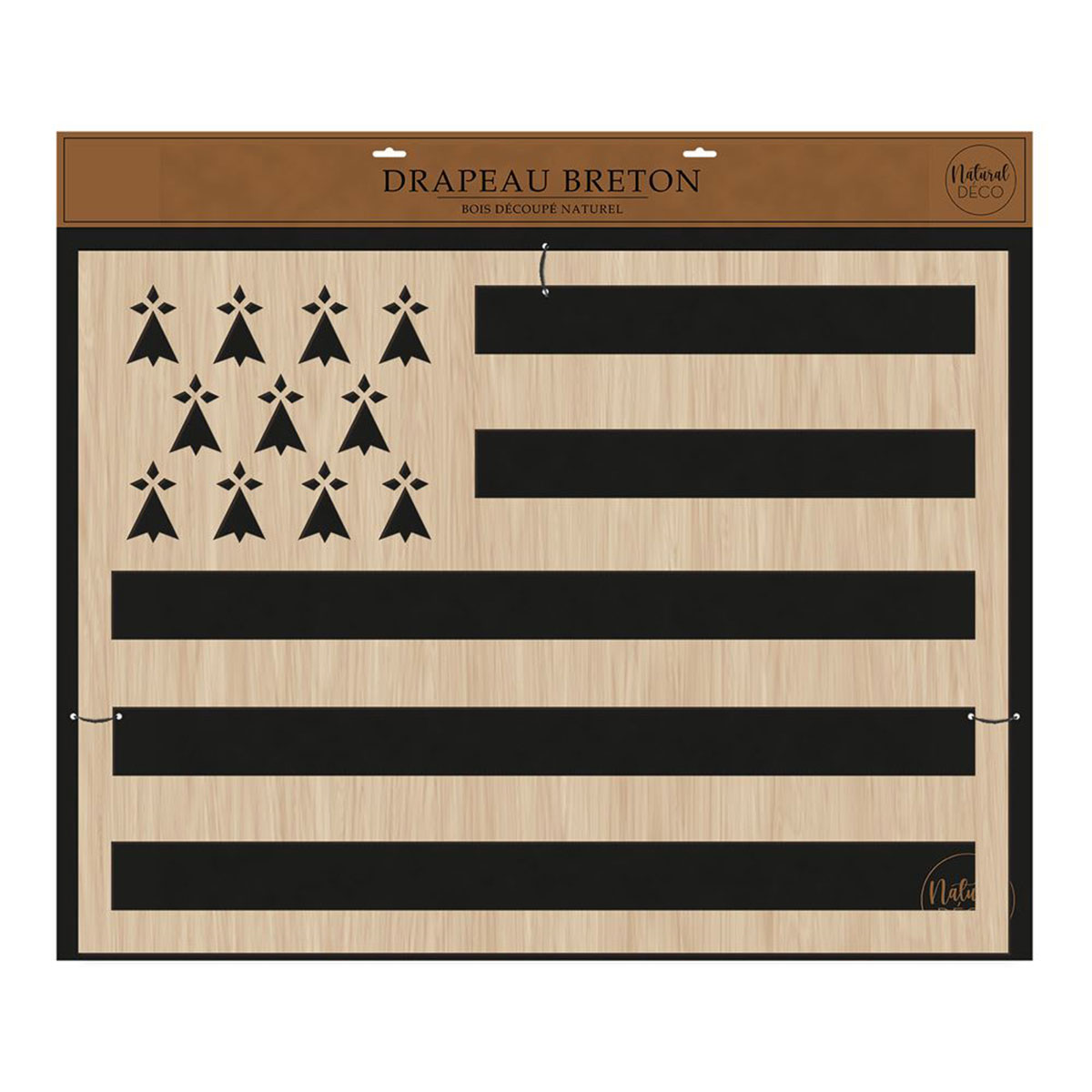 Décoration murale Drapeau Breton en bois – Gwenn ha Du – 90 cm – Sud Trading Company • Marque : Sud Trading Company • Décoration murale représentant le drapeau breton Gwenn ha Du • Matière : bois avec découpe ajourée • Couleur : bois clair • Dimensions : largeur 90 cm – hauteur 68 cm – épaisseur 0,4 cm Apportez une touche originale et authentique à votre intérieur avec cette décoration murale représentant le célèbre drapeau breton. Réalisée en bois avec une découpe ajourée, elle revisite le Gwenn ha Du dans un style décoratif moderne et chaleureux. Grâce à sa finition bois clair, cette décoration s’intègre facilement dans différents styles d’intérieur : maison de bord de mer, décoration bretonne, ambiance naturelle ou contemporaine. Avec ses grandes dimensions, elle devient une pièce décorative forte dans un salon, une entrée, une chambre ou un bureau. Une excellente idée cadeau pour un Breton ou pour tous les amoureux de la Bretagne.