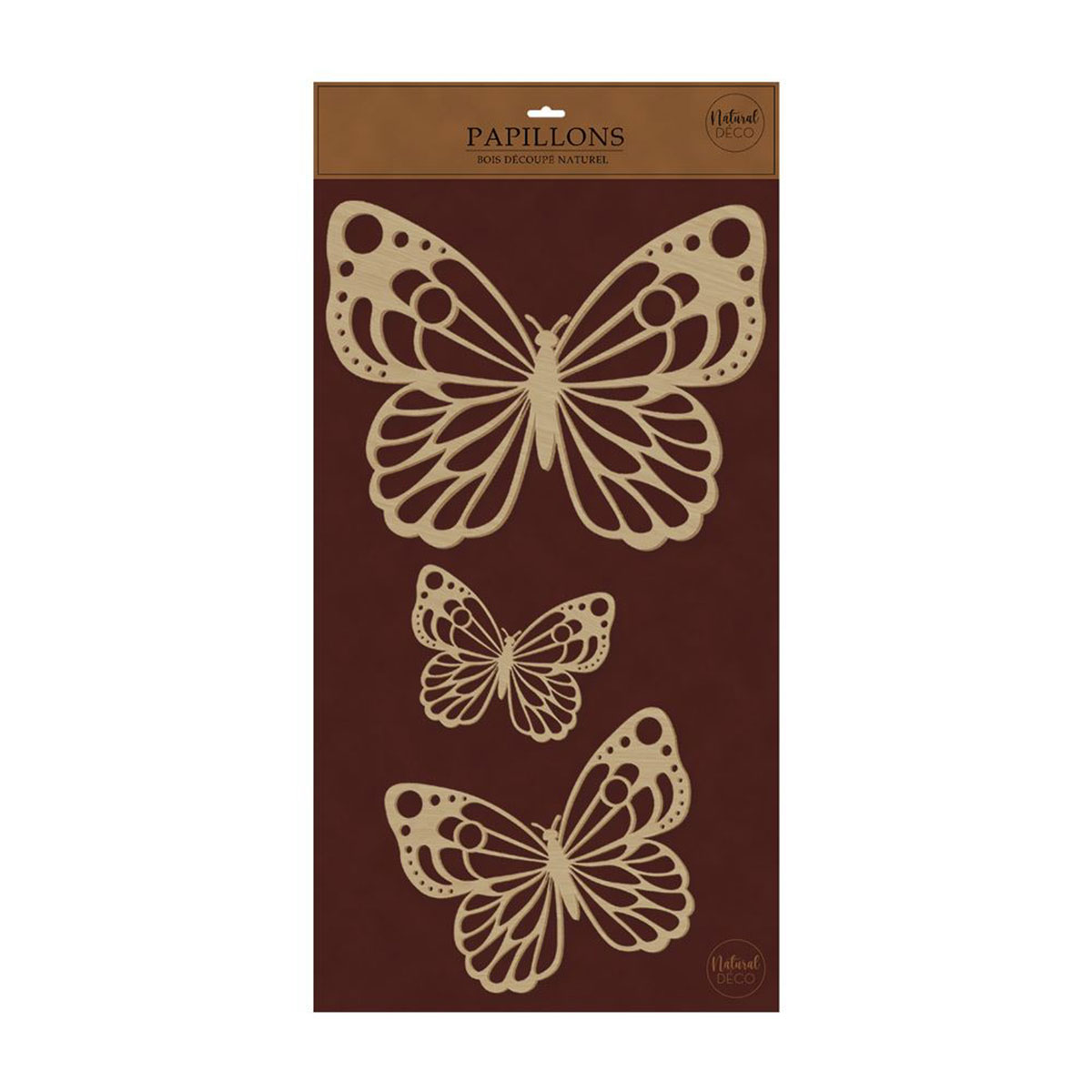 Décoration murale Papillons en bois – Set de 3 – Sud Trading Company • Marque : Sud Trading Company • Décoration murale composée de 3 papillons décoratifs • Matière : bois découpé • Couleur : bois naturel clair • Dimensions de la composition : largeur 31 cm – hauteur 40 cm – épaisseur 0,4 cm Apportez une touche de légèreté et de poésie à votre intérieur avec cette décoration murale composée de trois papillons en bois délicatement ajourés. Leur design élégant met en valeur les ailes finement découpées, créant un effet décoratif aérien et raffiné. Leur finition bois naturel clair s’intègre facilement dans différents styles d’intérieur : bohème, scandinave, naturel ou contemporain. Placés ensemble, ces papillons forment une jolie composition murale idéale pour décorer un salon, une chambre ou une entrée avec douceur et harmonie.