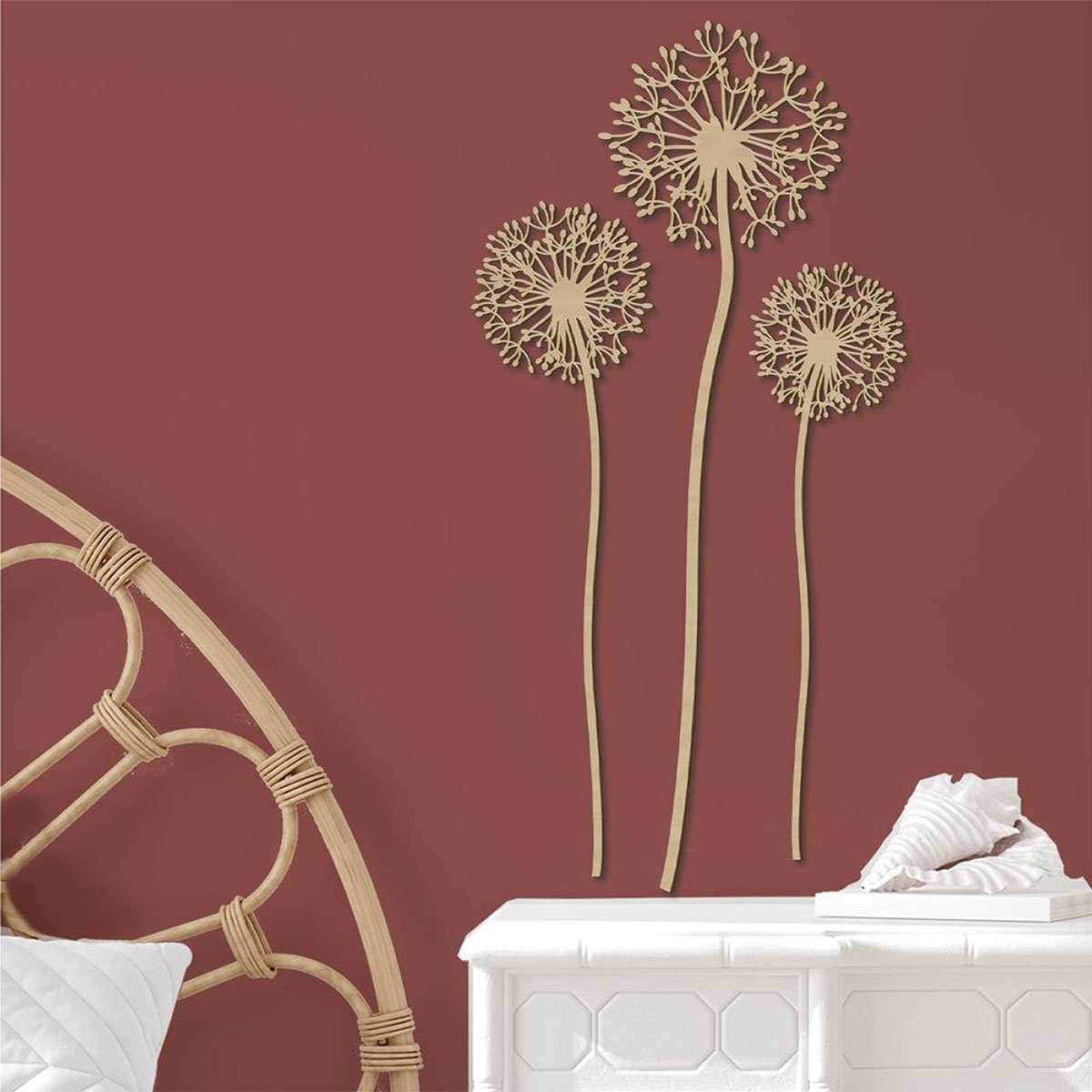 Décoration murale Pissenlits en bois – Set de 3 fleurs murales – Hauteur 80 cm – Sud Trading Company • Marque : Sud Trading Company • Décoration murale composée de 3 pissenlits décoratifs • Matière : bois avec découpe ajourée • Couleur : bois naturel clair • Dimensions : largeur 40 cm – hauteur 80 cm – épaisseur 0,4 cm Apportez une touche de nature et d’élégance à votre intérieur avec cette décoration murale représentant trois pissenlits en bois. Leur design ajouré met en valeur la finesse des graines de pissenlit et crée un effet décoratif léger et moderne. Réalisées en bois naturel clair, ces fleurs murales s’intègrent facilement dans différents styles d’intérieur : décoration bohème, scandinave, naturelle ou contemporaine. Avec leur hauteur de 80 cm, ces éléments décoratifs apportent du relief et du mouvement sur un mur. Installés ensemble ou légèrement espacés, ils créent une composition murale harmonieuse dans un salon, une chambre ou une entrée.