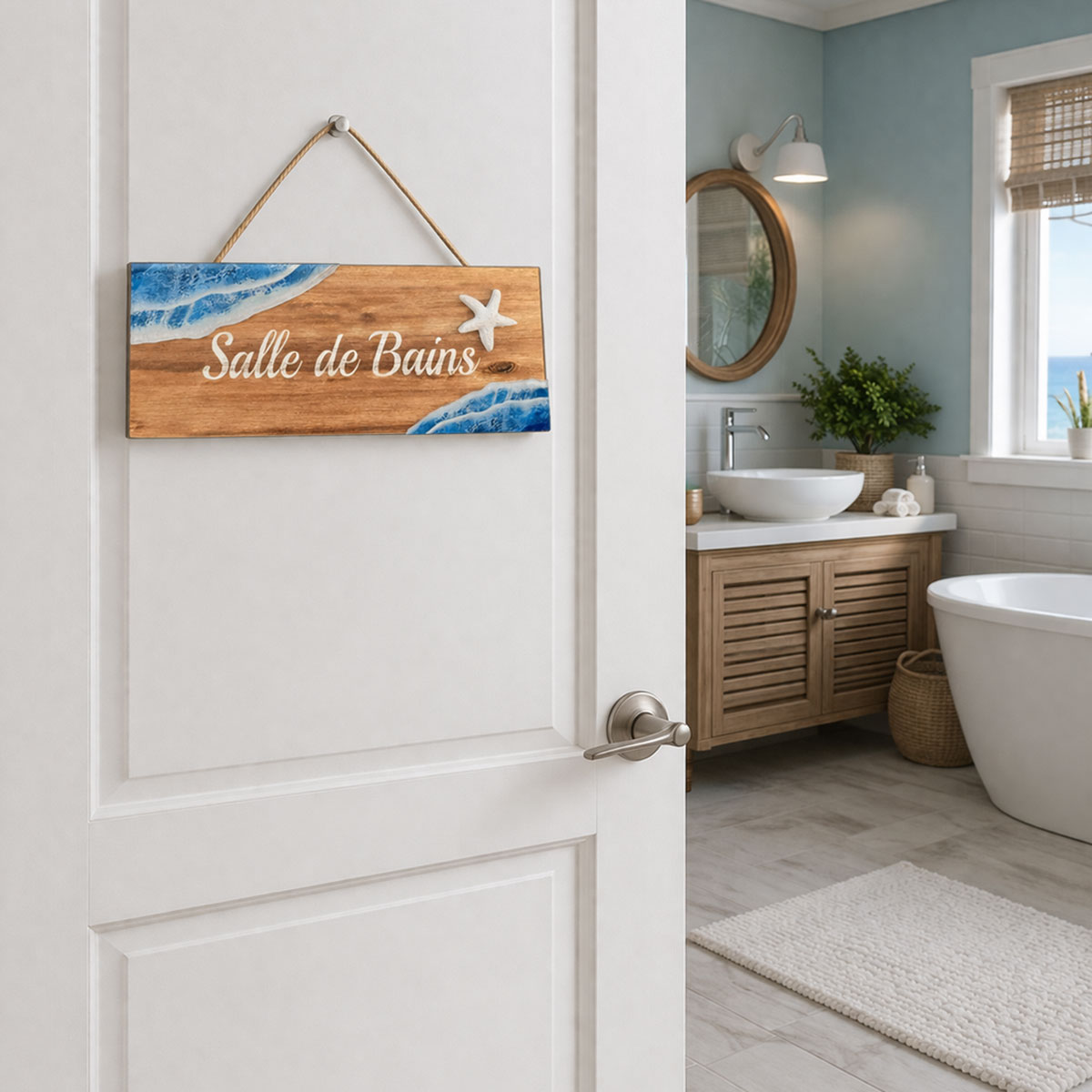 Plaque de porte Salle de Bains style bord de mer – décoration marine – MDF résine cordage – 20 x 8 cm • Plaque de porte décorative « Salle de Bains » esprit bord de mer • Design marin avec effet bois, vagues et étoile de mer • Dimensions : 20 x 8 cm – épaisseur 1 cm (hors cordage) • Matière : MDF, résine et cordage naturel • Facile à suspendre – idéale salle de bains, WC ou maison de vacances Apportez une touche marine à votre intérieur avec cette plaque de porte « Salle de Bains ». Son design inspiré du littoral, avec effet bois, vagues et étoile de mer, crée une ambiance douce et relaxante. Facile à installer grâce à son cordage naturel, elle se suspend en un clin d’œil sur une porte, un crochet ou un mur. Parfaite pour une salle de bains, une maison de vacances ou une décoration bord de mer.