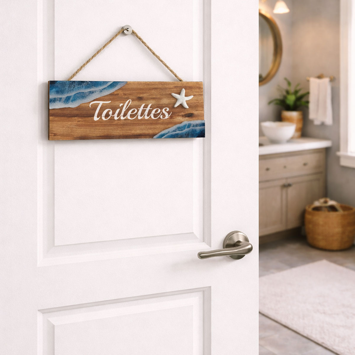 Plaque de porte Toilettes style bord de mer – décoration marine – MDF résine cordage – 20 x 8 cm • Plaque de porte décorative « Toilettes » esprit bord de mer • Design marin avec effet bois, vagues et étoile de mer • Dimensions : 20 x 8 cm – épaisseur 1 cm (hors cordage) • Matière : MDF, résine et cordage naturel • Facile à suspendre – idéale WC, salle d’eau ou maison de vacances Apportez une touche marine à votre intérieur avec cette plaque de porte « Toilettes ». Son design inspiré du littoral, avec effet bois, vagues et étoile de mer, crée une ambiance douce et relaxante. Facile à installer grâce à son cordage naturel, elle se suspend simplement sur une porte, un crochet ou un mur. Parfaite pour des toilettes, une salle d’eau ou une décoration bord de mer.