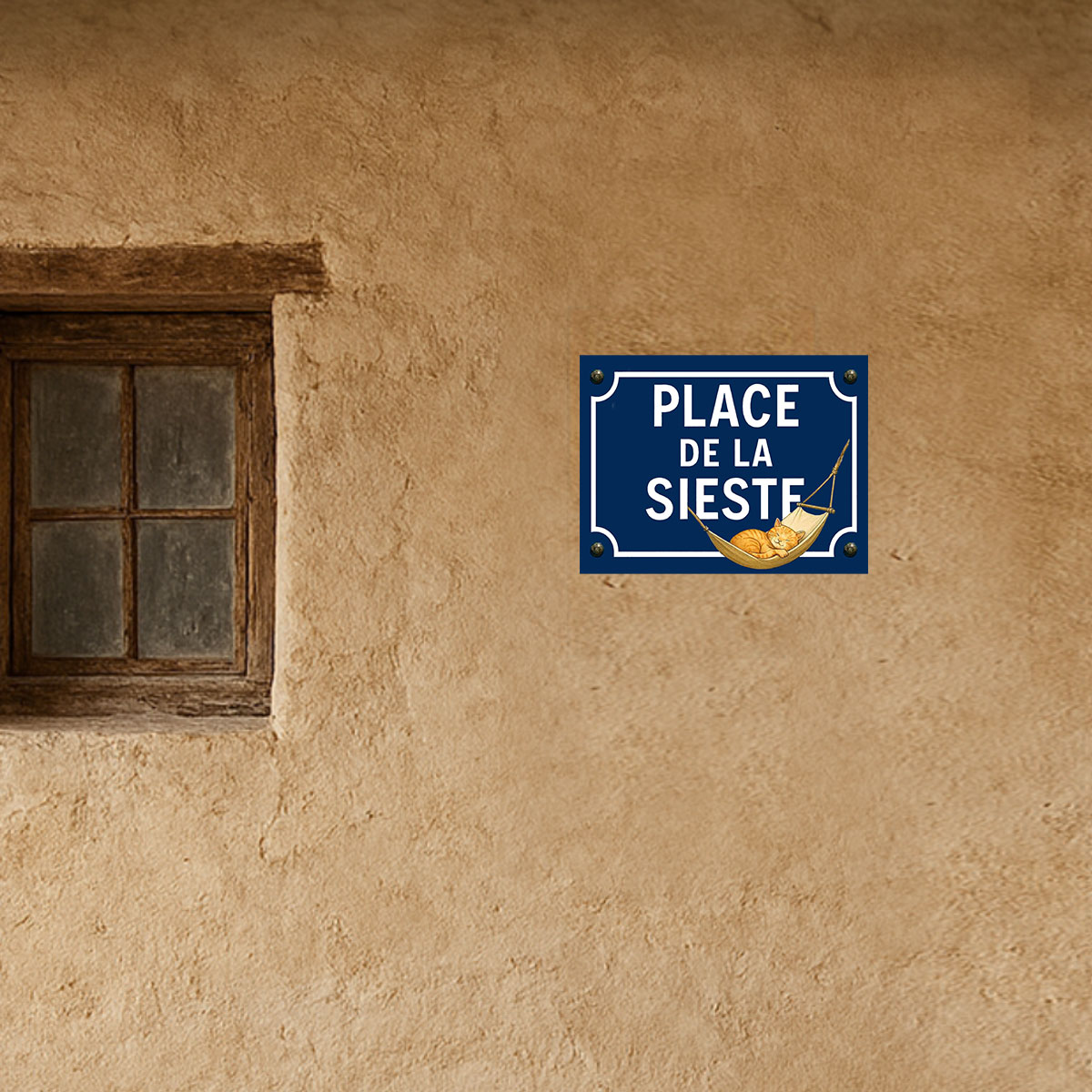 Plaque métal place de la sieste – chat – 20 x 15 cm
