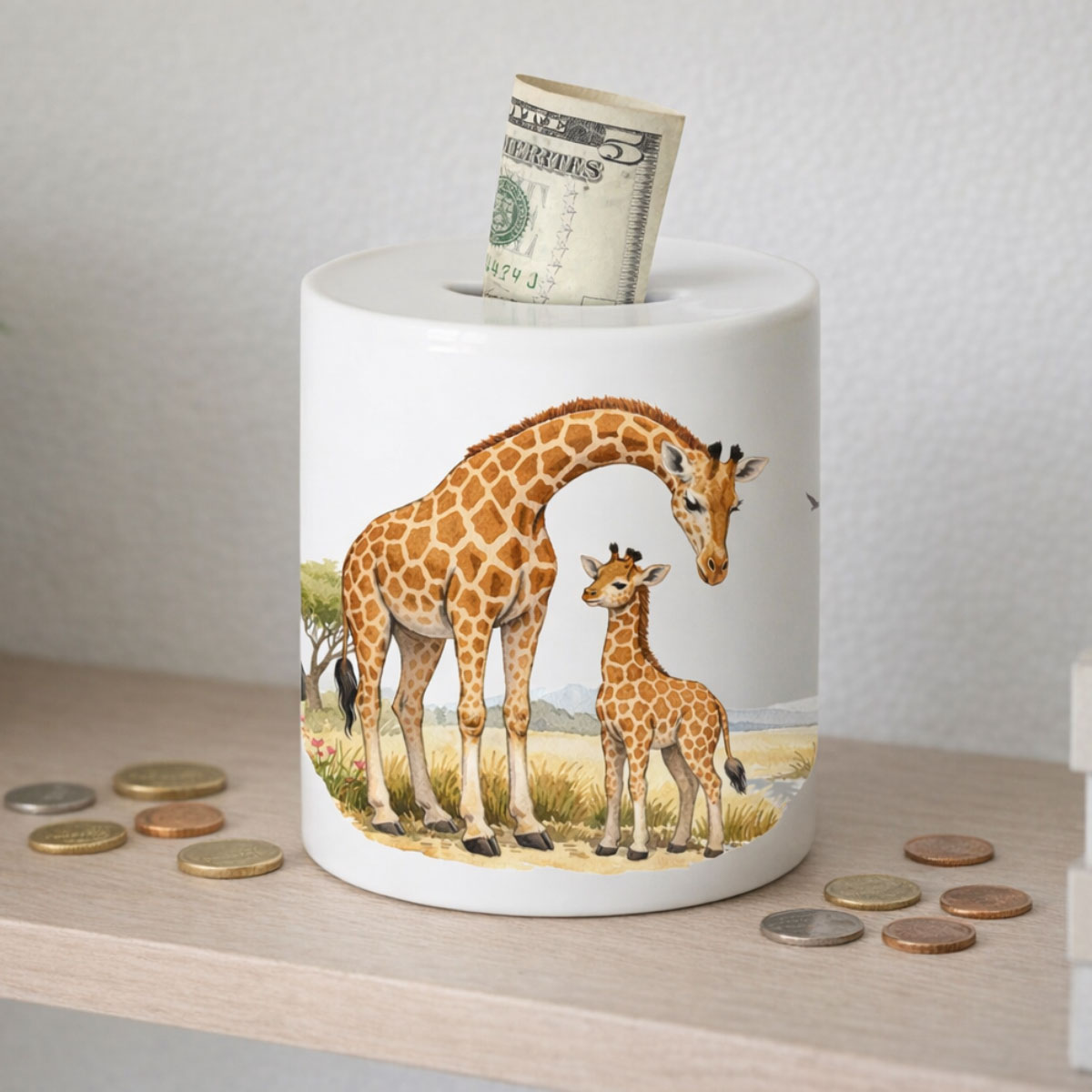 Cette tirelire Girafe en céramique accompagne l’enfant dans l’apprentissage de ses premières économies avec douceur. Son illustration poétique inspirée de la nature apporte une touche chaleureuse à la décoration d’une chambre d’enfant. La fente située sur le dessus permet d’insérer pièces et petits billets tandis que le bouchon placé sous la base offre une ouverture simple et pratique sans casser la tirelire. Son format compact est idéal pour une étagère, une commode ou un bureau. L’impression du visuel est réalisée en France pour un rendu lumineux et soigné.