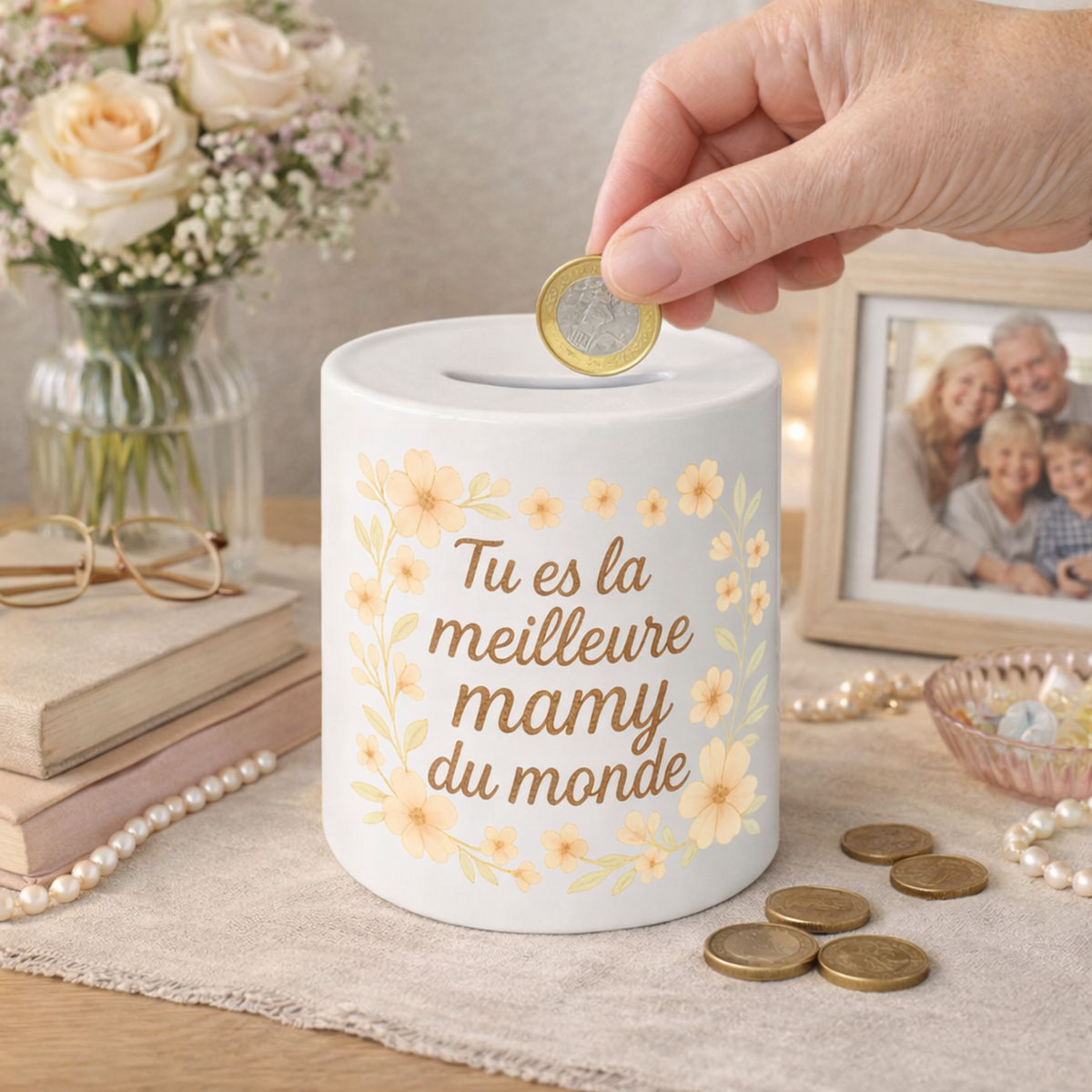 • Tirelire décorative spéciale mamie • Message : “Tu es la meilleure mamie du monde” • Fabricant : CBKréation • Matière : céramique • Dimensions : hauteur 9,5 cm – diamètre 8 cm • Ouverture par bouchon sous la tirelire • Impression du visuel réalisée en France 🇫🇷 • Idée cadeau parfaite pour la fête des grands-mères ou un anniversaire