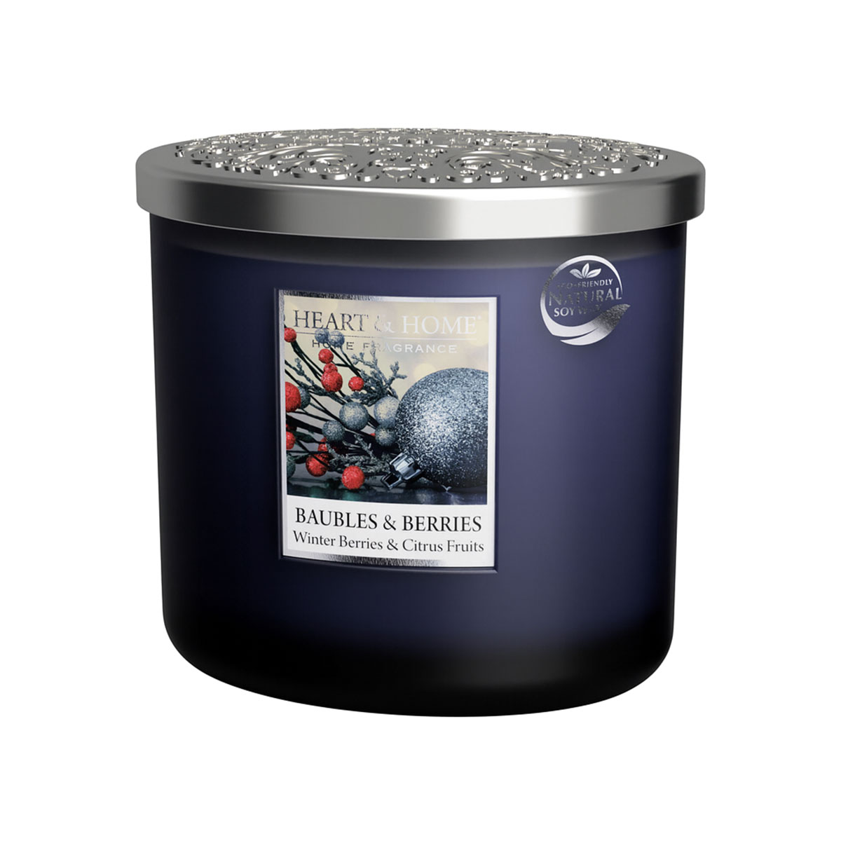 Caractéristiques : • Marque : Heart and Home • Collection : Boules Enchantées – Baies d’hiver et agrumes • Forme : Ellipse – 2 mèches • Dimensions : H 10 cm × L 10,5 cm × P 7,5 cm • Poids de cire : 220 g • Composition : cire de soja naturelle, mèches coton, jarre verre avec couvercle métal • Durée de combustion : jusqu’à 40 h
