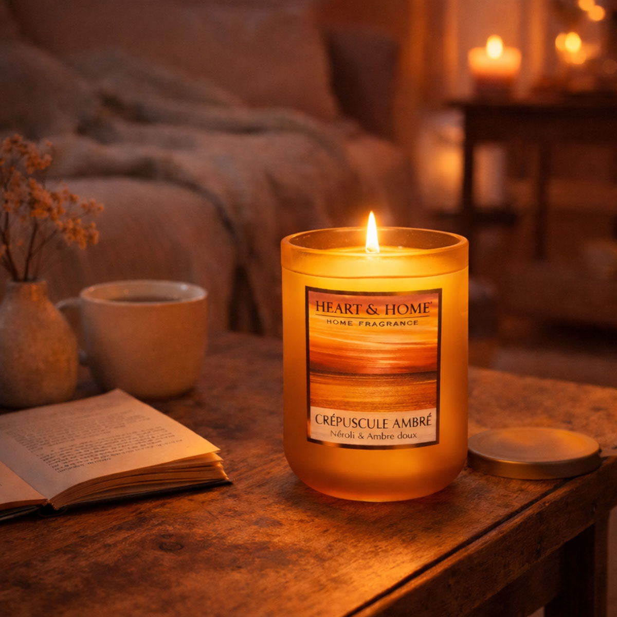 Grande bougie parfumée Crépuscule ambré 320 g – Orange, néroli & ambre doux – Cire de soja – Jusqu’à 75 h – Heart & Home • Marque : Heart & Home • Cire de soja renouvelable • Mèche en coton • Jarre en verre avec couvercle en métal • Pastille en métal • Durée de combustion : jusqu’à 75 heures • Dimensions : Hauteur 11 cm – Diamètre 9 cm • Poids : 320 g • Notes olfactives : zeste d’orange pétillant, fleur de néroli, ambre doux La grande bougie Crépuscule ambré diffuse une fragrance chaleureuse et élégante inspirée d’une fin de journée ensoleillée. L’éclat de l’orange s’ouvre sur un cœur floral de néroli avant de se fondre dans un ambre doux et enveloppant. Sa cire de soja assure une combustion propre et homogène, idéale pour parfumer durablement un salon ou une grande pièce. Sa jarre en verre avec couvercle en métal en fait également un bel objet décoratif et une parfaite idée cadeau.