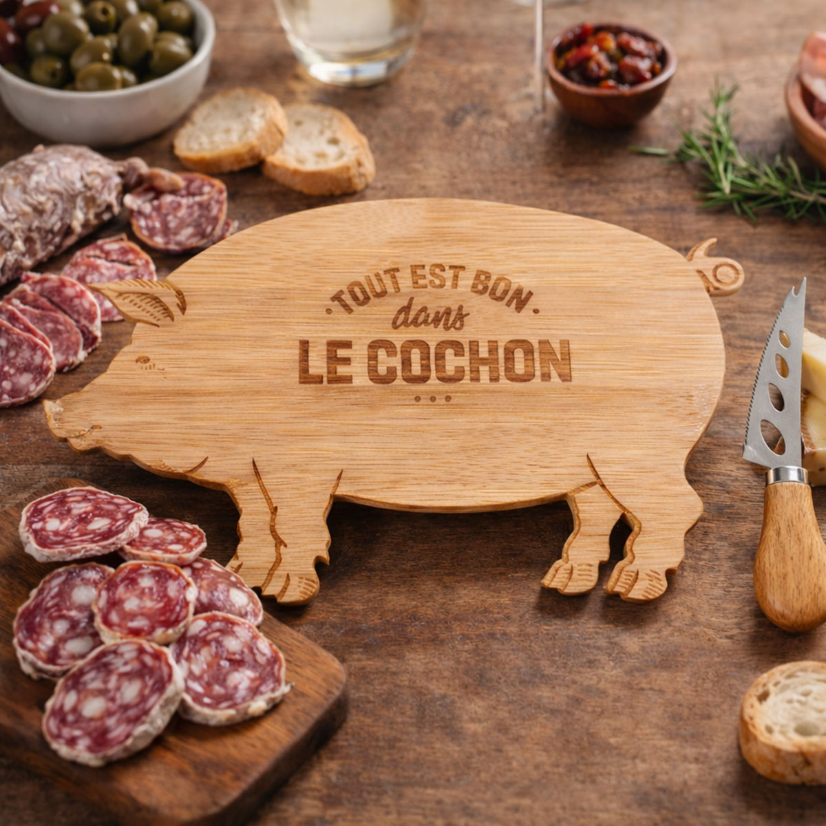 Ce coffret comprend une planche apéritif en bambou originale découpée en forme de cochon et gravée avec l’inscription "Tout est bon dans le cochon".