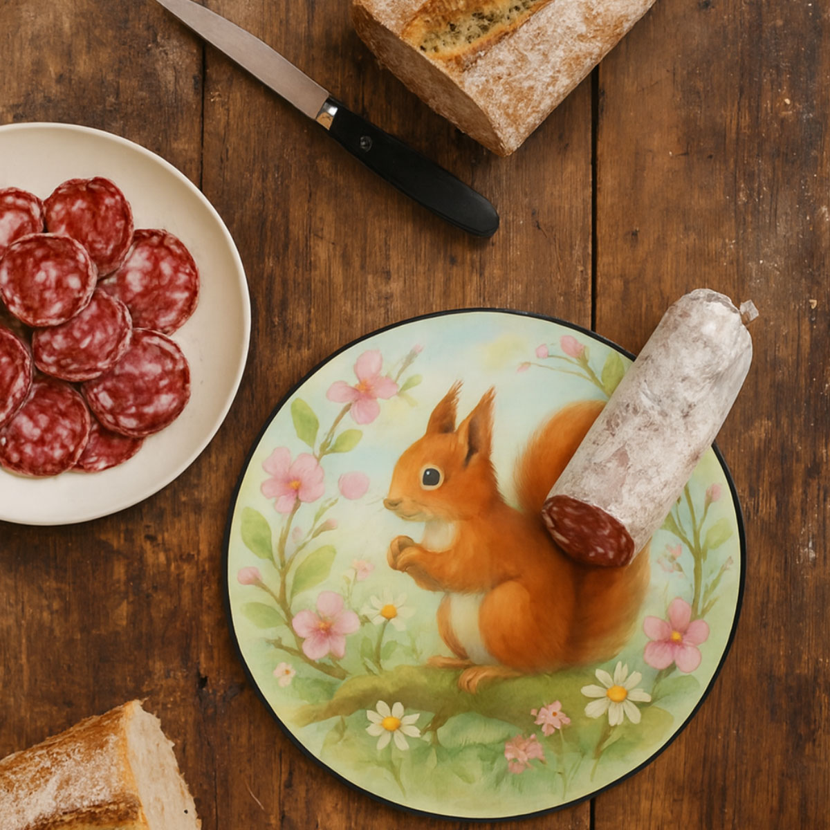 Planche à découper et sous-plat rond en verre écureuil 29 cm – Illustration nature – CBKréation