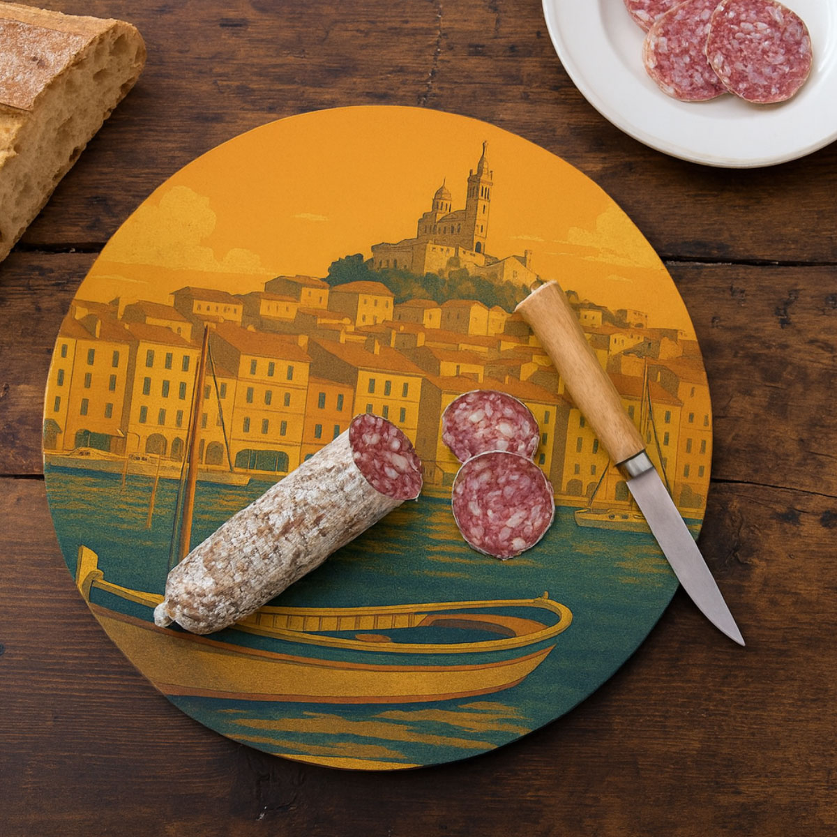 Description : Apportez l’atmosphère ensoleillée de Marseille dans votre cuisine avec cette planche à découper ronde en verre décorée du Vieux-Port et de Notre-Dame de la Garde. Son illustration chaleureuse rend hommage à la cité phocéenne et à son art de vivre méditerranéen.