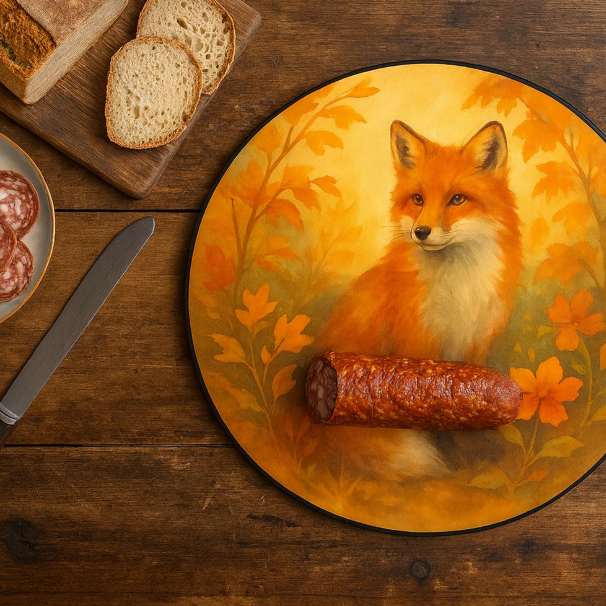 • Illustration automnale représentant un renard dans un décor naturel aux teintes chaudes • Verre résistant et hygiénique, adapté à la découpe des aliments et à une utilisation en sous-plat • Impression réalisée en France avec un rendu de haute qualité et des couleurs durables • Grand format rond 30 × 30 cm, pratique pour un usage quotidien en cuisine • Idée cadeau originale pour les amateurs de décoration et de nature