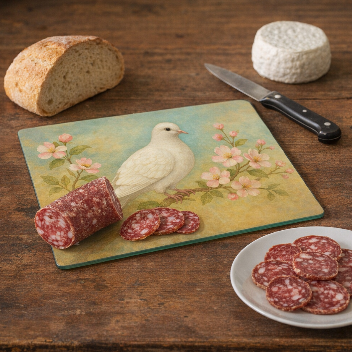 Planche à découper verre colombe 28,5 x 20 cm CBKréation • Planche à découper en verre granité dimensions 28,5 x 20 cm • Illustration style aquarelle doux et élégant • Surface résistante hygiénique et facile à nettoyer • Peut également être utilisée comme dessous de plat • Fabrication française impression de qualité Une colombe blanche se tient calmement sur une branche fleurie. L’illustration adopte un style aquarelle aux tons pastel doux. Des fleurs blanches et des feuilles entourent l’oiseau dans une composition équilibrée. Le fond flou renforce l’atmosphère paisible et poétique. L’ensemble évoque la douceur, la paix et la délicatesse artistique.Conçue en verre granité, elle est résistante et facile d’entretien pour un usage quotidien. Polyvalente, elle peut servir de planche à découper, de support de présentation ou de dessous de plat.