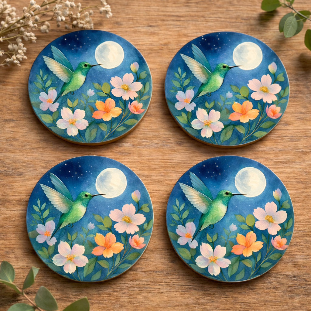 Apportez une touche poétique et lumineuse à votre table avec ce set de 4 dessous-de-verre illustré d’un délicat colibri volant sous la pleine lune parmi des fleurs pastel.