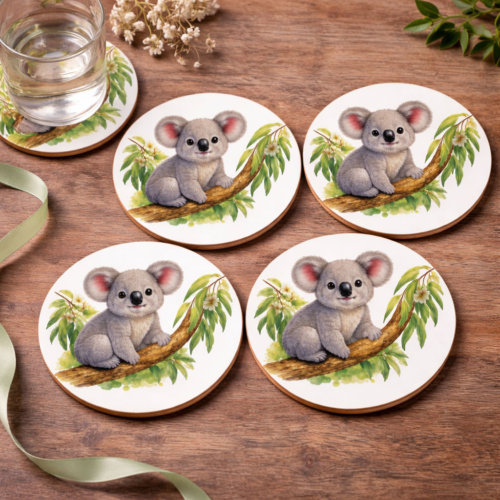 Ce set de 4 dessous-de-verre met en scène un adorable koala posé sur une branche d’eucalyptus dans un décor naturel lumineux et apaisant.