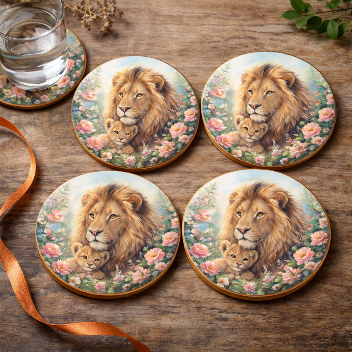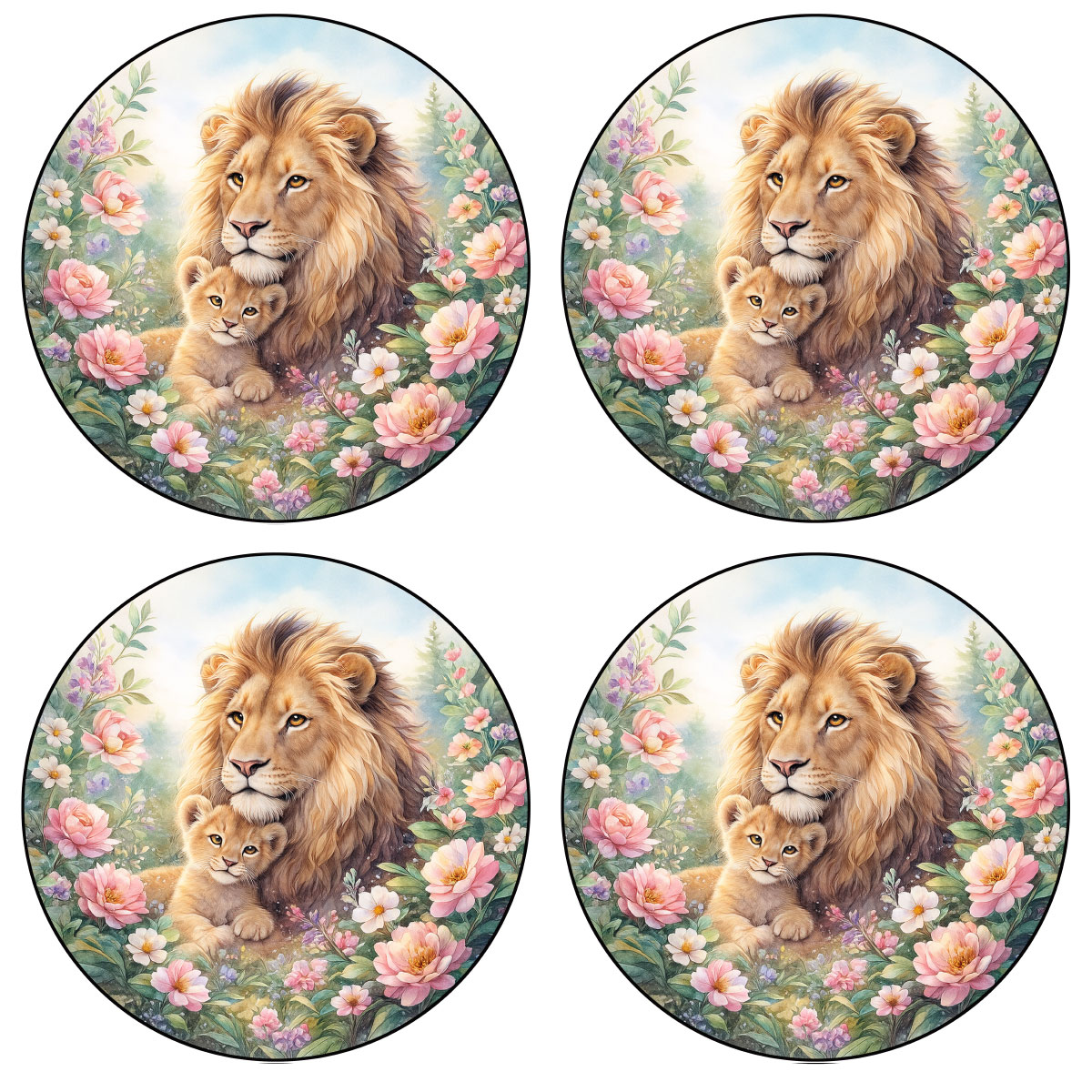Set de 4 dessous-de-verre lion et lionceau fleuris – Ø 9,5 cm – Dessous de verre ronds décoratifs – CBKréation • Fabricant : CBKréation • Matière : Fibre de bois avec surface lisse et brillante • Dimensions : diamètre 9,5 cm • Set de 4 dessous-de-verre assortis • Couleurs dominantes : beige, rose et vert pastel Ce set de dessous-de-verre décoratif met en scène un majestueux lion accompagné de son lionceau au cœur d’un décor floral doux et poétique. Son illustration élégante apporte une touche naturelle et chaleureuse à votre table tout en protégeant efficacement vos meubles des traces de verres. Grâce à leur surface lisse et brillante en fibre de bois, ces dessous-de-verre sont parfaits pour un usage quotidien lors de vos pauses café, thé ou apéritif.