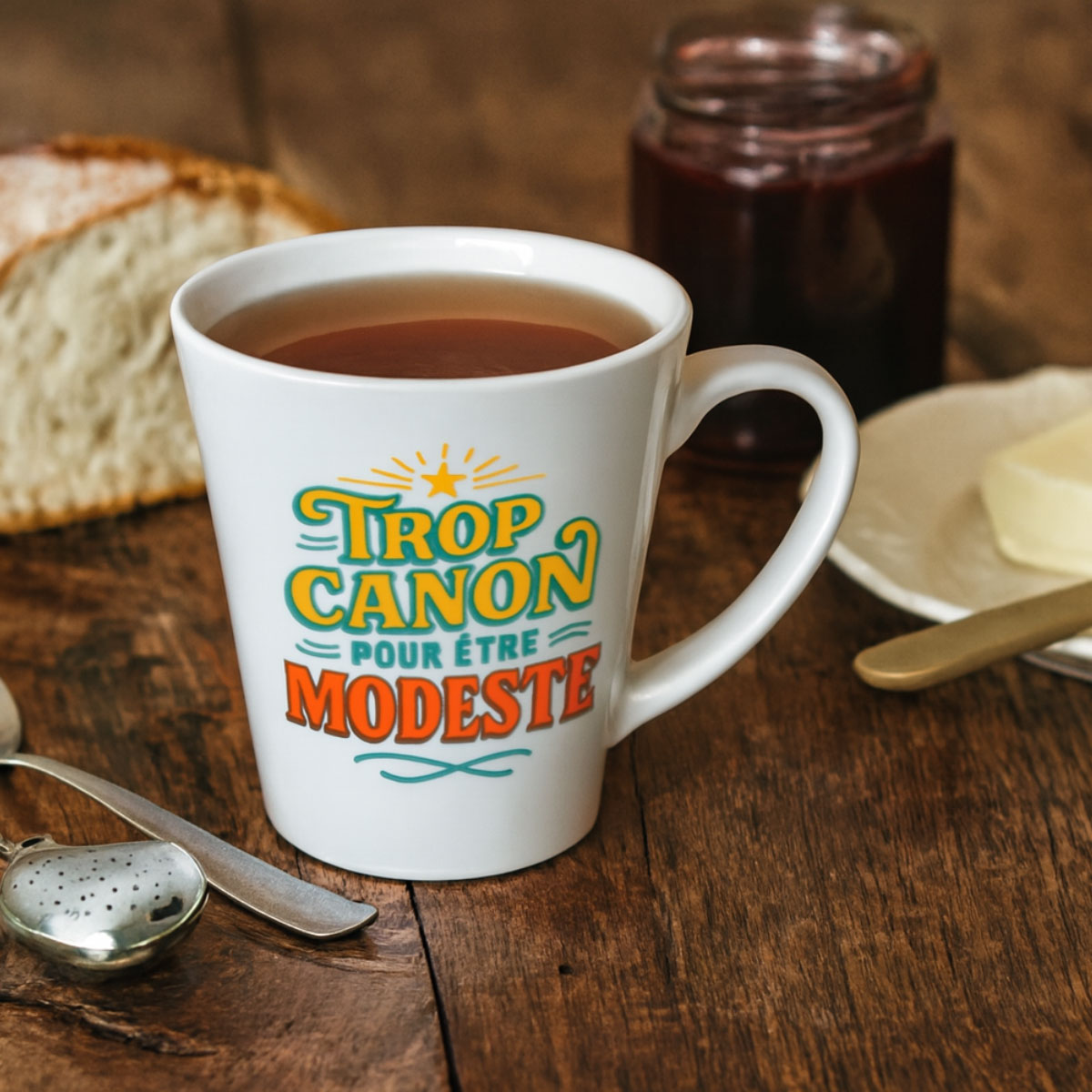 Mug Conique Trop canon pour être modeste – CBKréation – 320 ml Un mug coloré et plein d’humour pour ceux qui assument leur charme sans modestie ! Son design rétro apporte une touche fun à chaque café. • Fabricant : CBKréation • Matière : Céramique • Dimensions : Diamètre 9 cm × Hauteur 10 cm • Contenance : 320 ml • Format : Mug conique • Impression française durable • Idée cadeau parfaite pour les personnalités confiantes