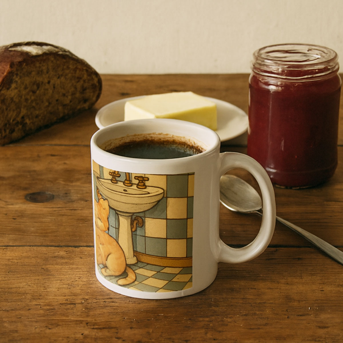 • Mug en céramique blanche illustré d’un chat dans une scène de salle de bain au style rétro • Dimensions : hauteur 9,5 cm × diamètre 8 cm • Contenance : 350 ml, idéal pour café, thé ou chocolat chaud • Impression française de haute qualité, rendu soigné et durable • Fabricant : CBKréation