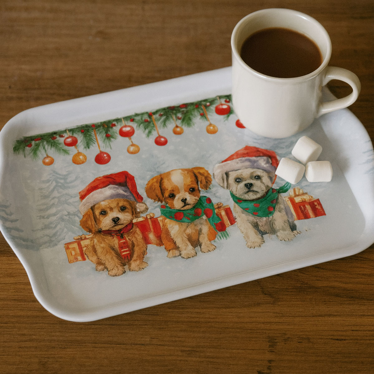 Un plateau adorable illustré de trois chiots festifs dans un décor enneigé et scintillant. Parfait pour le service, la décoration ou les petits-déjeuners de fête.