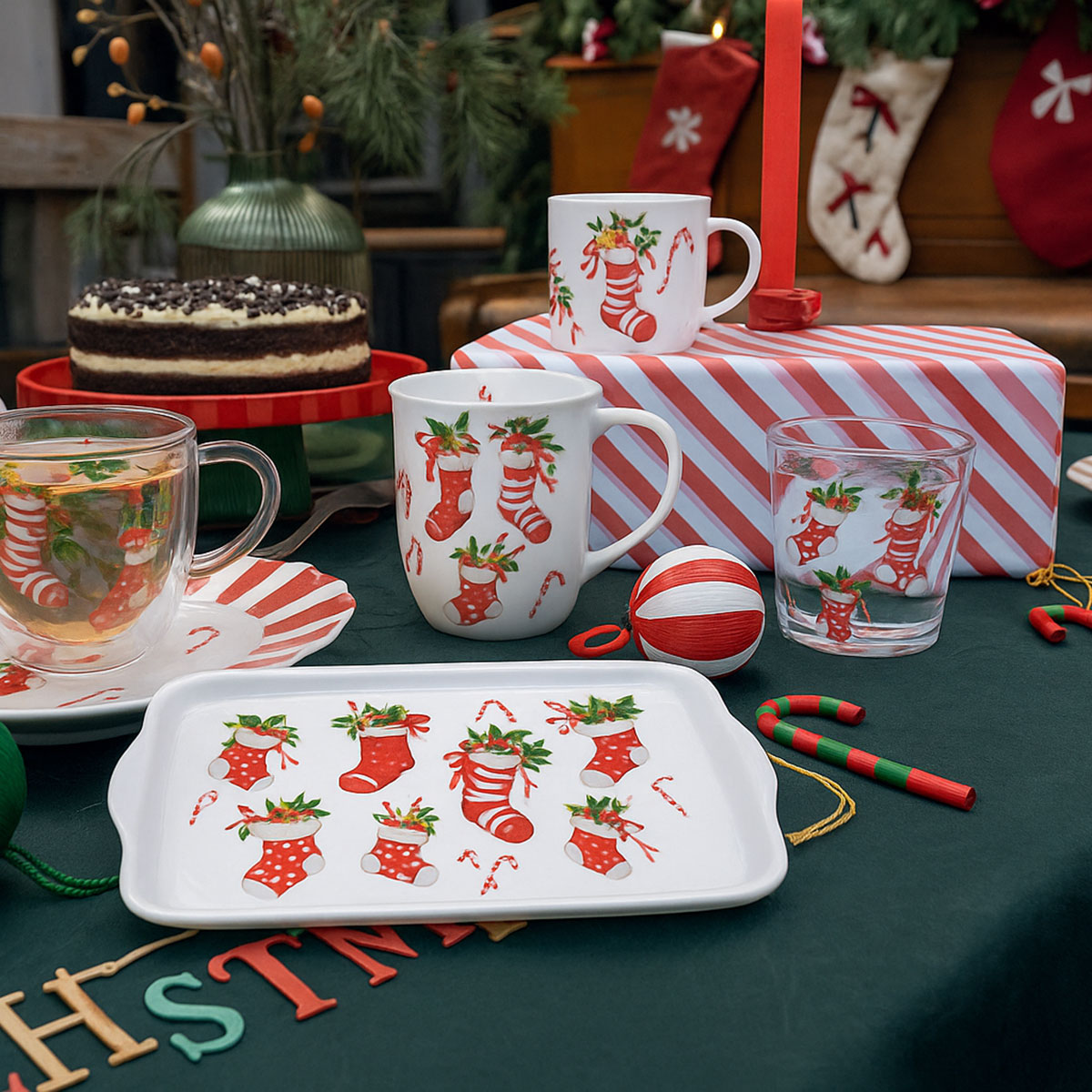 Un plateau festif et coloré pour célébrer la magie de Noël. Motif joyeux : chaussettes rouges et blanches remplies de friandises et feuillages d’hiver. Léger, résistant et idéal pour le service ou la décoration.